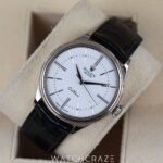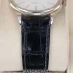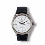 Encased in polished 18k white gold, the 39mm case exudes a quiet confidence, striking a harmonious balance between bold presence and understated refinement. The pristine white dial, adorned with elongated Roman numerals and sleek hour markers, offers a clean, minimalist aesthetic that captivates at first glance. The delicate dauphine hands glide gracefully, ensuring precise timekeeping with every tick.