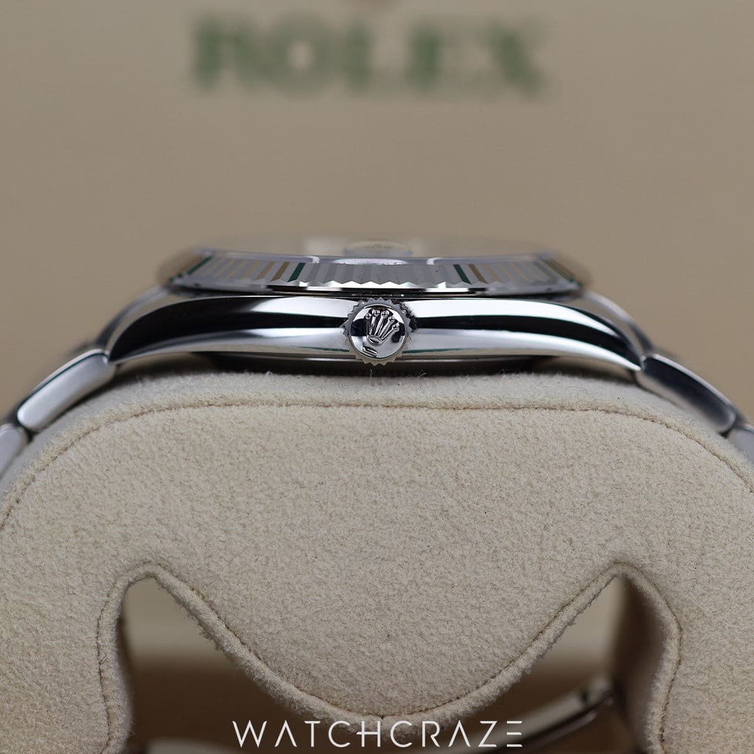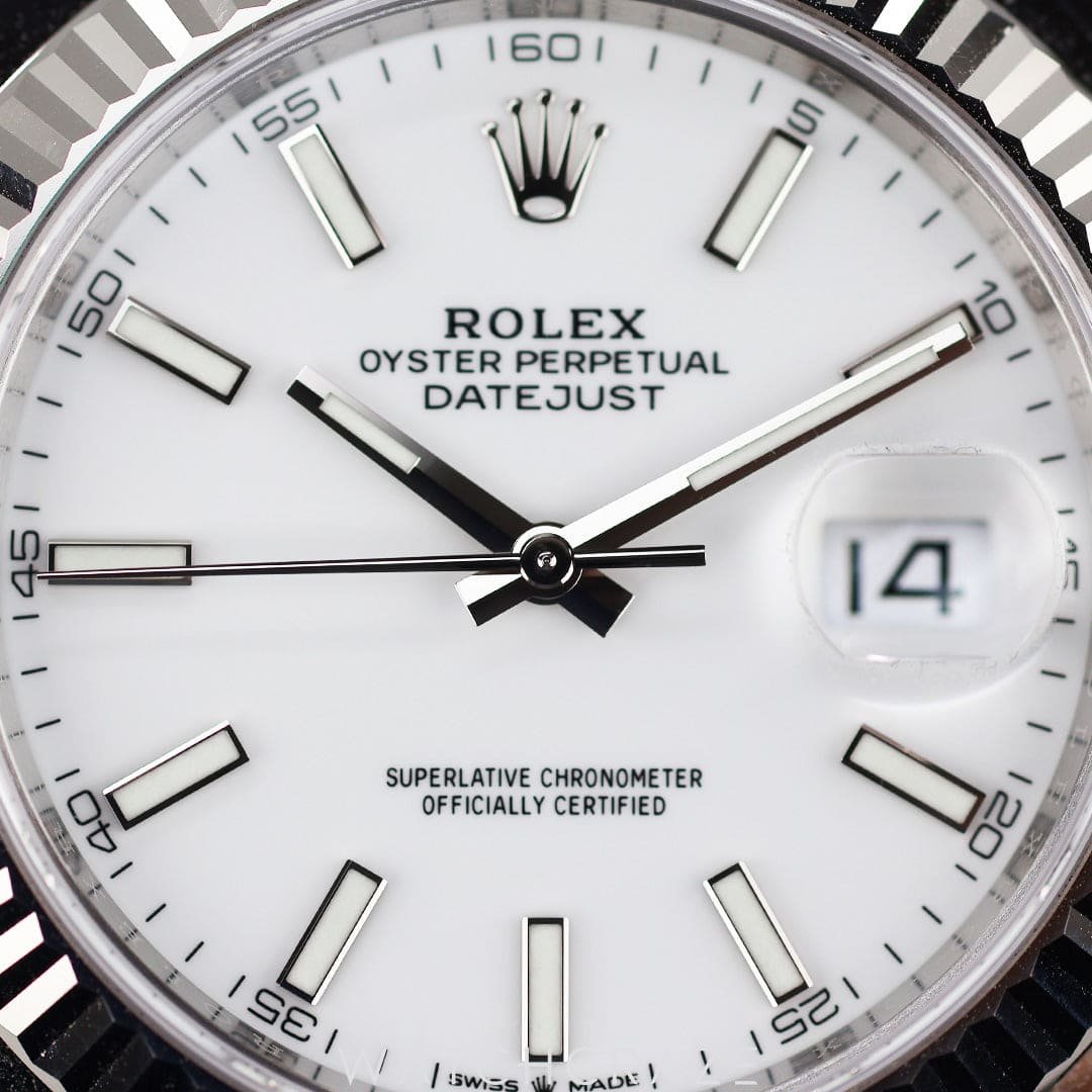 Unveil the pinnacle of luxury with the 2022 Rolex Datejust White Dial 41mm 126334, a masterpiece sculpted in stainless steel. This distinguished watch boasts a commanding 41mm case, exquisitely accented with a lustrous white gold fluted bezel that captures the light with every turn of the wrist. Its crisp white dial is meticulously set with elegant Roman numerals, while the iconic Rolex Cyclops lens gracefully magnifies the date display—a hallmark of precision and convenience.
